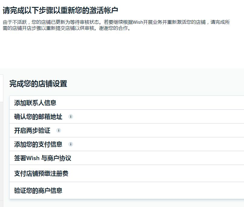 近日,有不少卖家反馈自己的Wish账号被判定为“非活跃账号”,需要提交部分店铺信息重新认证,如果该账号之前没有缴纳注册费,则需要再补交2000美金店铺预缴注册费激活,才能重新开店交易。