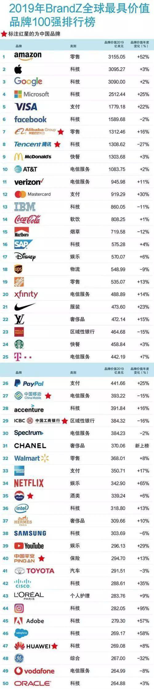 2019年BrandZ全球品牌价值100强出炉:亚马逊第一,阿里腾讯前十