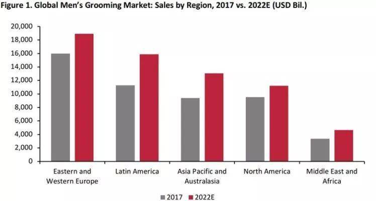 全球最大的男士美容市场是西欧,2017年该类别销售额为123亿美元,预计2017年至2022年间的复合年均增长率为3.1%。而2017年东欧该类别的销售额为36亿美元,预计2017年至2022年间的复合年均增长率将达到4.4%。
