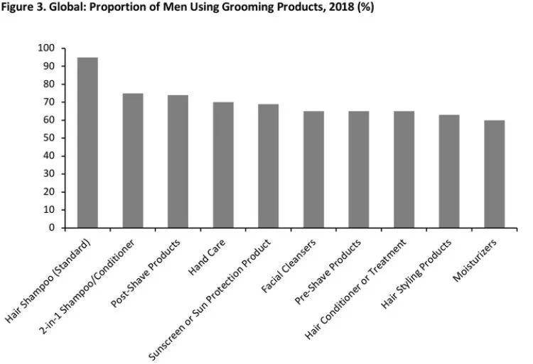 根据欧睿国际的年度美容调查,男士的个人美容活动首先是护发和剃须,全球超过40%的男士报告说他们每天用洗发水洗头,而每天使用洗面奶的人数为25%。下图显示了全球男士使用的十大美容产品。