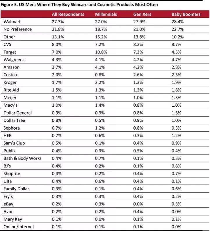 在欧睿国际(Euromonitor International)进行的一项调查中,超过56%的美国男士受访者承认,他们在2018年至少使用过一次粉底、遮瑕膏或BB霜等面部化妆品。