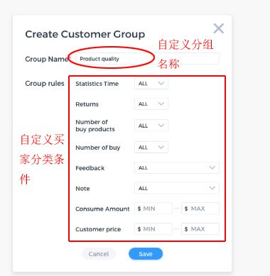 具体怎么理解?比如,把购买折扣产品、购买数量大于2、有复购行为的用户设置为一个标签——“折扣营销用户”;把给过差评feedback的的用户设置为另外一个标签——“低营销价值用户”,等等。这里的条件设置完全依据卖家运营经验,可以根据实际运营需求,生成个性化的group(见图1)。