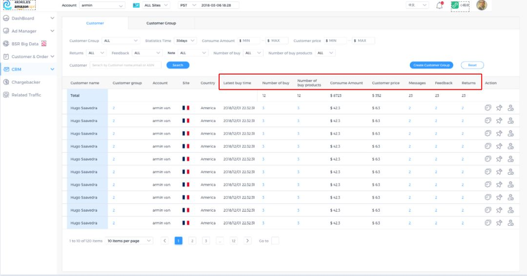 在4KMILES的CRM系统里,买家信息会被集中展示,买家购买产品的金额、数量、客单价、次数、产品品类等都能完整显示,不同用户的信息被分类梳理在一起,制定用户画像。以下是对单个买家的分析(见图3):