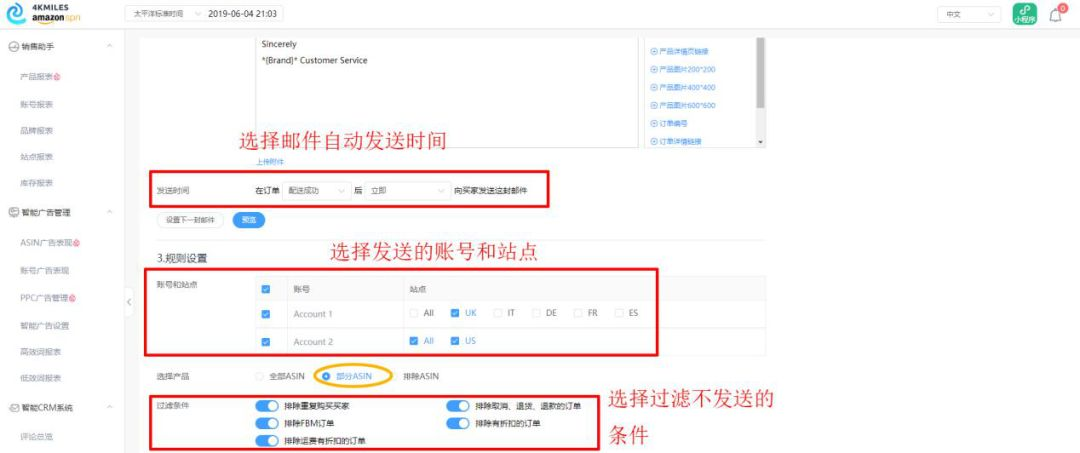 首先根据指定的营销策略设置好发送内容;然后设置自动发送的时间和规则,比如设置在配送成功后立即向买家发送。多账号多站点卖家先设置发送的账号及站点,选择对应的ASIN(见图4)。过滤掉不适合再发送索评邮件的人群,比如有取消订单、退货、退款行为的买家,还有重复购买、有折扣订单的买家,等等。