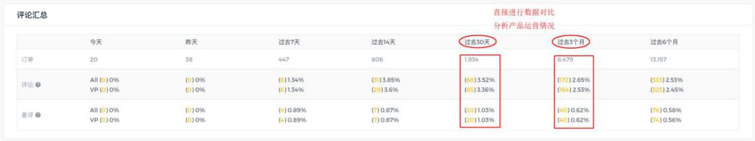 比如我对最近30天的订单量、评论总量和差评数(率)与最近3个月进行对比,对比发现差评率明显增长,我们查找在买家消息回复或者产品质量方面出现了问题,如果是订单量出现大幅度减少,可以去查找关键词或者广告方面是否需要优化。
