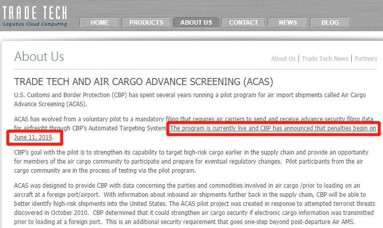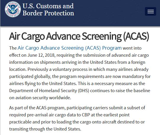 2018年6月12日,CBP发布了航空货物预先筛选计划,简称“ACAS”。该计划是美国海关(CBP)与运输安全管理局(TSA)为加强空运货物安全而制定的联合计划。