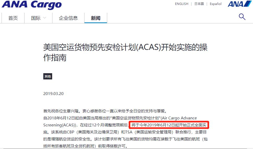 自2018年6月12日起由美国当局推出的"美国空运货物预先安检计划"(Air Cargo Advance Screening(ACAS)),在经过12个月调整宽限期后,将于今年2019年6月12日起开始正式全面实施。该系统由CBP(美国海关及边境保卫局)和TSA(美国运输安全管理局)联合推行,主要目的是增强航空货运的安全性。该计划要求所有飞往美国的货物均需在装载于飞往美国的航班(包括所有旅客航班及全货机航班)前取得搭载许可。