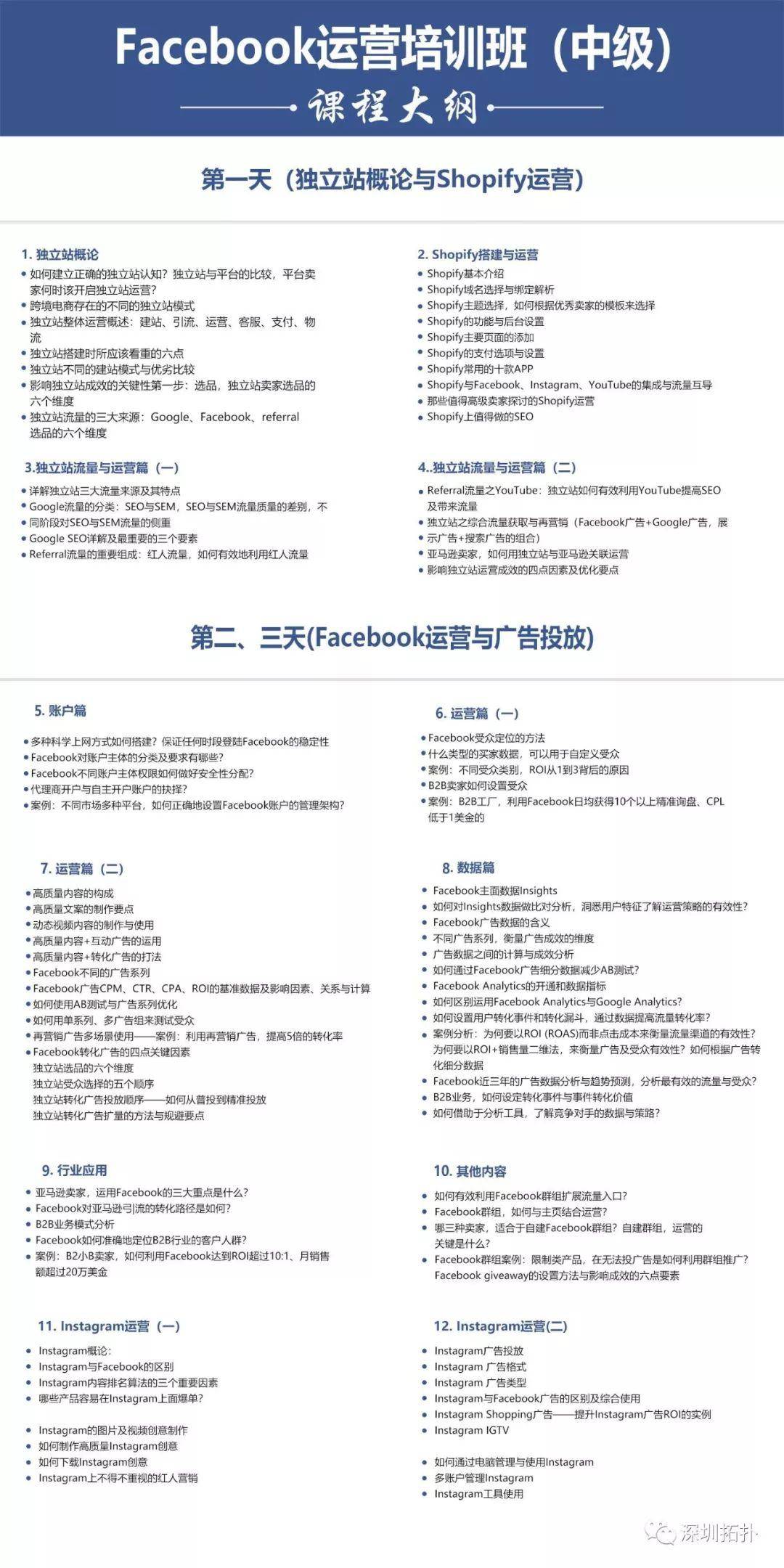 (1)三天课程集中式线下理论随堂实操,学习Facebook运营所需全部知识、技能,建立运营思路;
