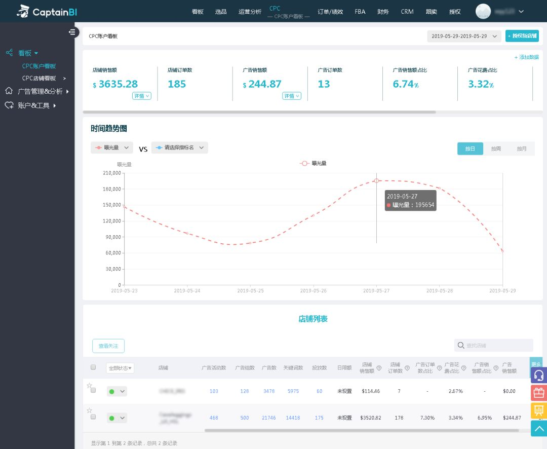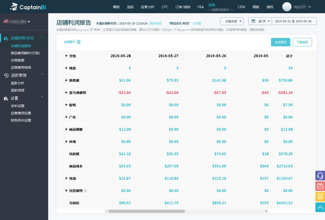【船长BI-经营分析师】功能,主要包含“店铺销售分析”与“店铺财务分析”,通过店铺和商品两个维度,深入促销、物流、广告、仓储和佣金等费用,结合详细数据图表进行分析,帮助卖家及时跟踪盈亏,并为每个店铺生成完整的利润报告,各种费用收支一目了然。