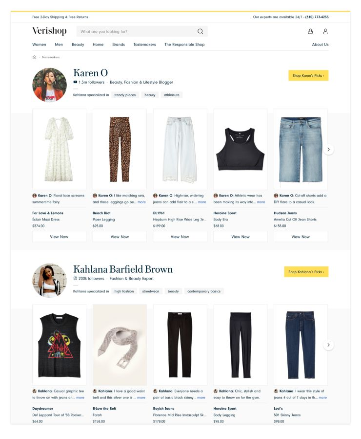 Verishop另一个独特之处在于它有一个名为Tastemakers的版块,在这里有影响力的社交红人可以在Verishop上挑选自己最喜爱的商品,并向他们的粉丝推广。目前已经与7个知名人士签约,如Youtube网红Tiffany Ma,她的粉丝数达180多万,歌手兼美容博主Jess Conte,她在Instagram上有210万粉丝。每个名人在Verishop上都有自己独立的页面,他们可以展示自己最喜欢的产品,并简单描述一下选择它们的理由。