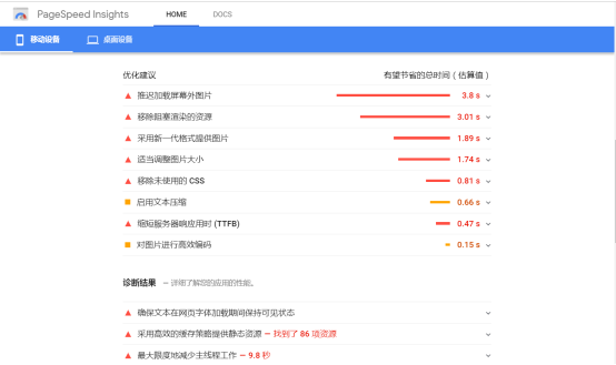 这是谷歌的一款功能强大的工具,可以免费使用。它可以在移动端和电脑端对网站进行速度测试,进行打分,并给出提高页面速度的建议。