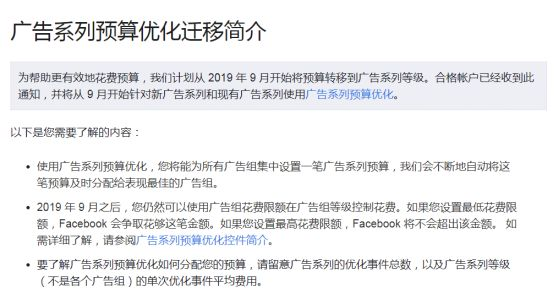 在Facebook广告帮助中心中,关于预算优化转移到广告系列层面,Facebook是这样解释的,链接地址: