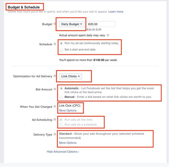 每个广告组的预算至少应该是50美元,那么广告系列的预算至少应该是250美元。预算太低FB的优化空间会很小。