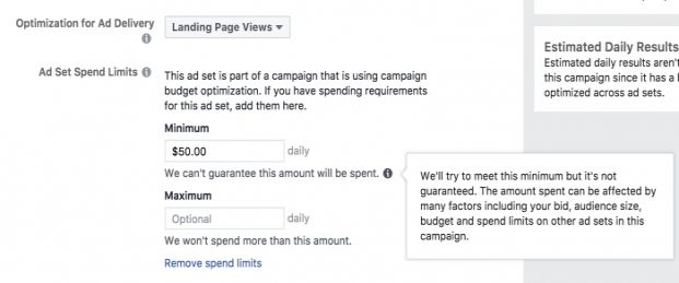如果想要控制FB的预算分配,可以在budget & schedule部分给每个广告组设置限额(ad set spend limits),制定预算最大额或最小额。