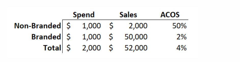 下面,我们来看一看这个别人分享的PPC的案例,总体预算是2000美金,然后我们看看这个广告其中customer search term的数据,非品牌搜索词ACOS是50%,创造了2000美金的销量。品牌搜索词ACOS是2%,创造了5000美金的销售额。整体综合一下acos就是4%,一共创造了52000美金的销售额。