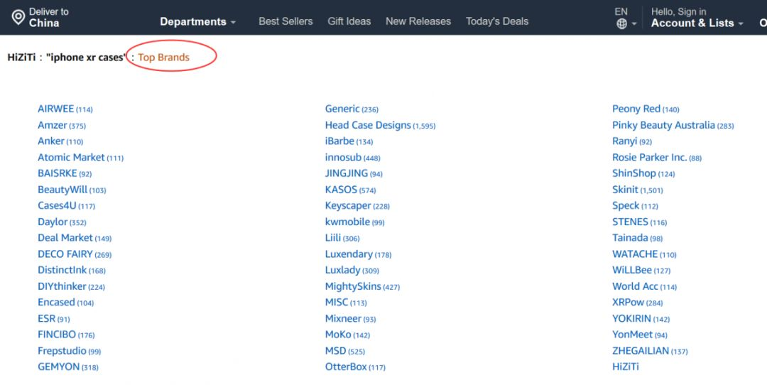 基于这个案例,我们以后再做PPC时,需单独列出一个所谓的品牌Campaign,这个Campaign是和其他campaign相隔离的,然后我们把这个listing的类目项下,所有排在前列的品牌词Top brands都找出来(如下图所示),然后统统丢进broad匹配里面,这里强调一下,直接可劲的丢单一的品牌名词即可,不用带产品词的,因为基于品牌词的broad匹配肯定能帮你跑出来与产品相关的词汇的。至于预算和竞价,和你的非品牌搜索词campaign保持一致即可。
