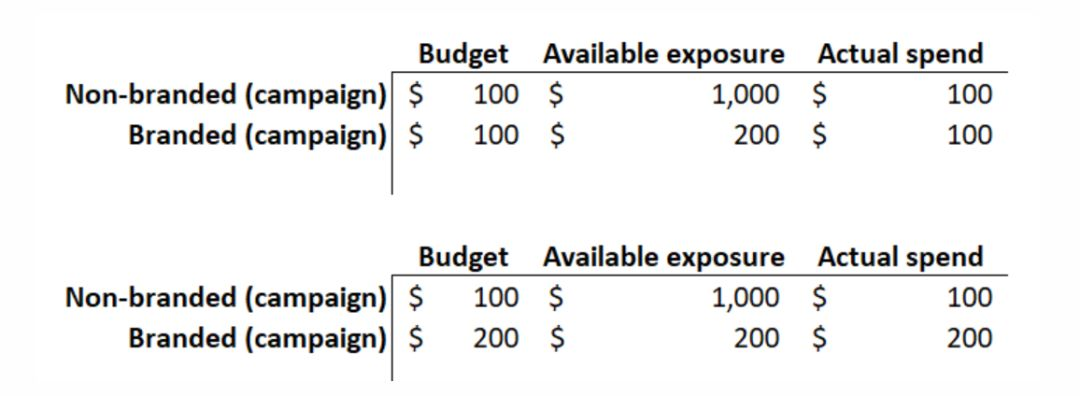 这样我们就能够成功的把品牌搜索词和非品牌搜索词给分开了,换句话说,就是单独做一个品牌搜索词的专属campaign。这样我就能够根据这两个campaign的数据表现,如下图所示,来进行人为的预算合理分配了: