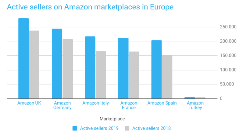 据了解,2019年欧洲的亚马逊平台上有超过110万名活跃的卖家,在亚马逊英国站和德国站之后,活跃卖家数最多的是亚马逊意大利站。根据Marketplace Pulse的数据,这个站点的活跃卖家比法国站更多了5000名。