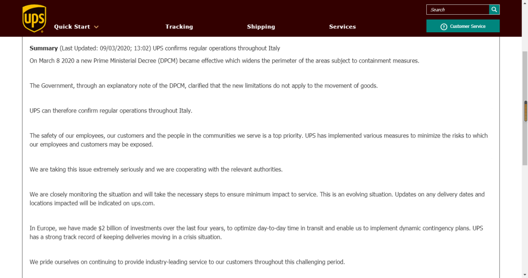 上述提到意大利货物运输不会被封锁,UPS于9号在其官网发公告表示,虽然意大利扩大了围堵区域范围,但新的限制不适用于货物运输,UPS可以确认整个意大利的正常运营。