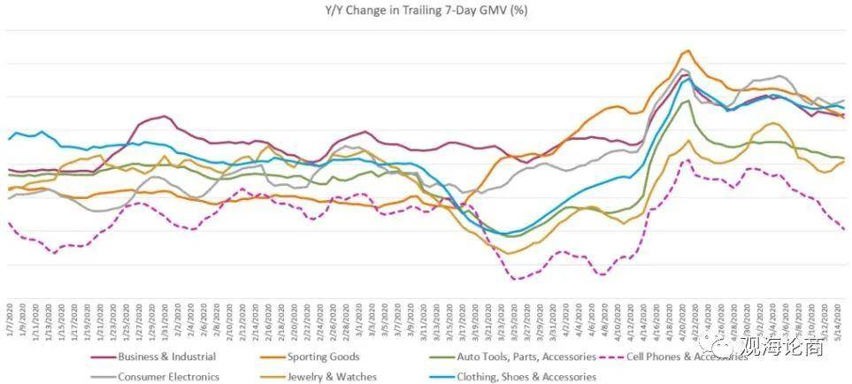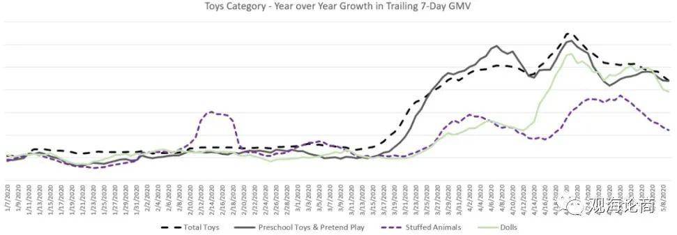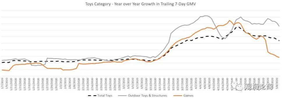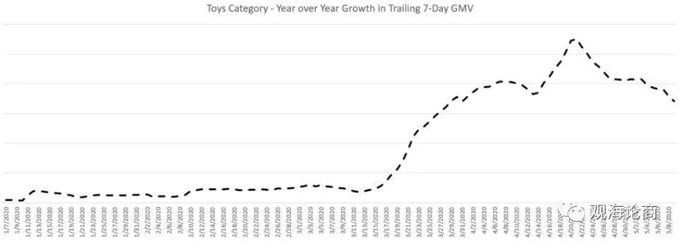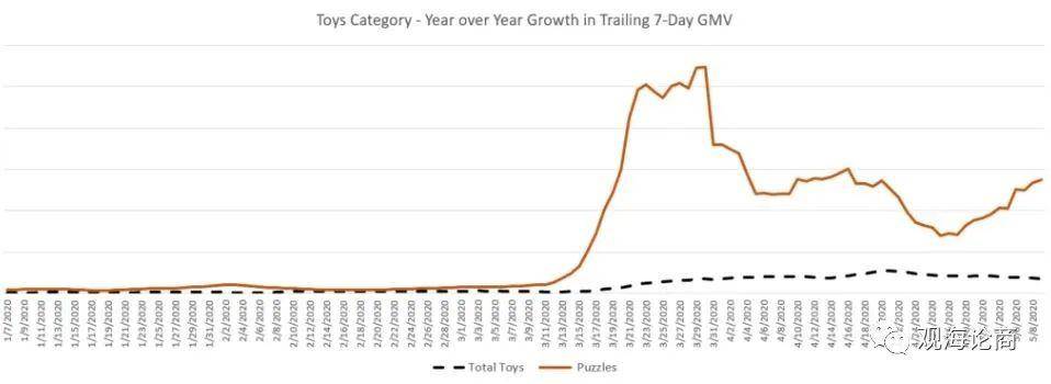 有一些与疫情期间比较相关的、有趣的小类别得到了快速的增长,比如户外蹦床和拼图等。但其实整个品类都经历了有浮动的增长,还有一些比较大的子品类是值得我们更深入研究的。这一部分的数据是截止到2020年5月9日的数据。