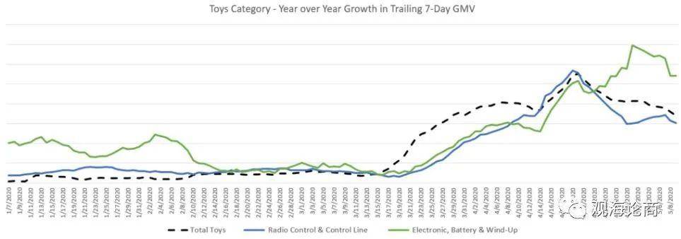 无线电控制和电子玩具大致与总体类别一致。电子玩具的增长在4月下旬超过了总体类别,并在5月初一直保持强劲增长。