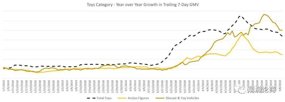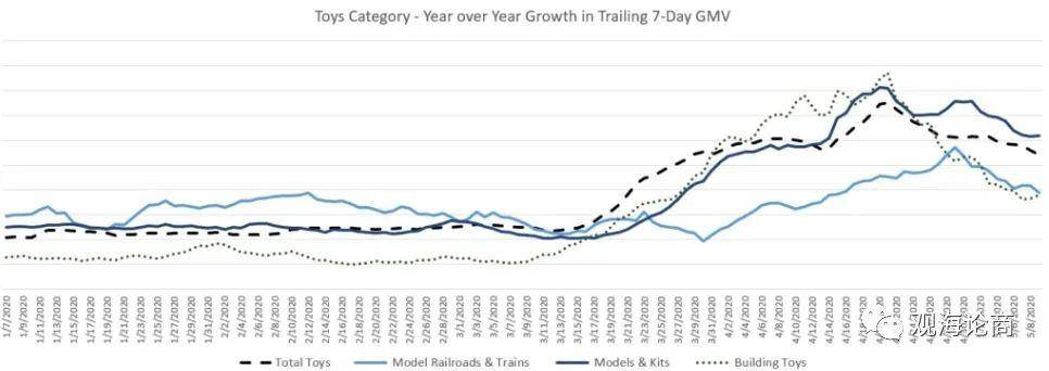 首先,我们来看看整体玩具品类的增速趋势。从下图可以看出,从3月中旬开始同比增速明显上升,大约是在美国(以及亚洲以外的许多国家)开始居家隔离的时候。
