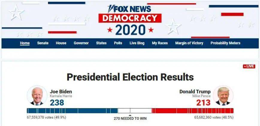 截止侃哥发稿前,美国大选开票仍在持续。据美国FOX NEWS最新数据显示,截至北京时间11月4日17时,共和党总统候选人特朗普拿下213张选举人票,民主党总统候选人拜登拿下238张选举人票。