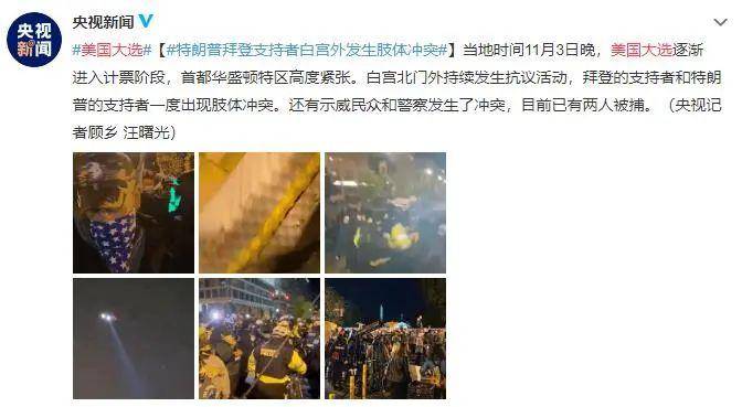 而事实也证明了上述推测。据央视新闻消息,当地时间11月3日晚,白宫北门外上千人聚集,持续发生抗议活动。拜登的支持者和特朗普的支持者一度发生肢体冲突。