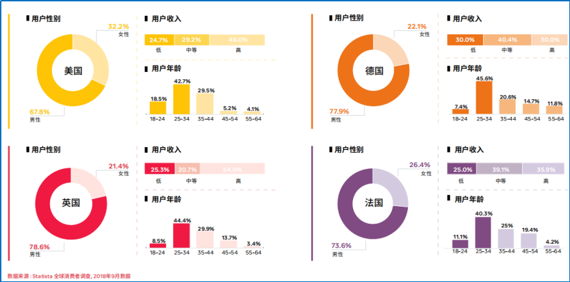 而另一个值得注意的变化是,使用约会交友服务的用户正在朝年轻化和精英化方向发展。根据 Statista 数据,在海外付费习惯比较好的美国、英国、法国、德国等成熟市场,典型用户画像是“ 25-34 岁的中高收入男性”。