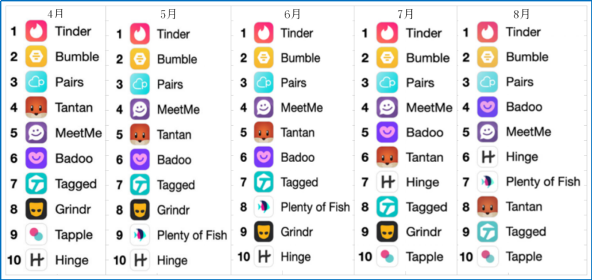 根据 Sensor Tower 数据,虽然 2020 年 4-8 月全球最赚钱的 10 款约会交友 App 一直由 11 款 App 轮流霸榜,但只有前三的 Tinder、Bumble 和 Pairs 成绩稳定。而第 4-10 名的 App 则排名波动很大,POF、Grindr、Tapple 等 3 款 App 甚至都曾跌出 Top10。