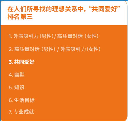 根据 Facebook 公布的调查数据显示,用户在寻找一段理想关系时排名 Top3 的要求是:外表、高质量对话和共同爱好,女性甚至会将高质量对话放在第一位。外表无法改变,但如何帮助用户产生一段高质量的对话、帮助用户找到对方的共同爱好,或许是可以思考的方向。平台帮助用户寻找可以产生有趣对话的内容,就像给了用户活跃的梯子。