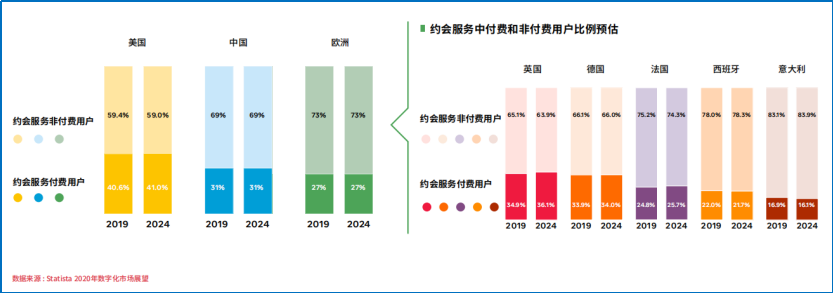 根据 Statista 发布的约会交友付费用户比例数据,美国>中国>欧洲,以上三个市场付费用户占比均超过 25%。因此很多约会交友 App 出海后会优先考虑美国和欧洲,原因也很明确用户付费习惯好、付费能力强。