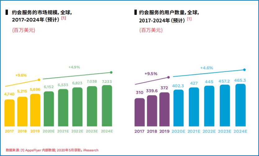 根据最新的《Facebook 约会类应用营销指南》中 2020 年数字化展望数据,2019 年全球相亲约会市场的收入到 58 亿美元,毫不夸张地说在很多地区约会类的用户基数都是最大的。