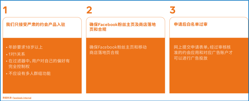 根据《Facebook 约会类应用营销指南白皮书》的数据,Facebook 对于约会交友 App 的审查有一套透明化、系统化的要求。约会交友广告主在获得书面许可后才可以在 Facebook 上投放广告。