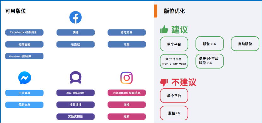 还是Facebook为例,广告主想在 Facebook 进行广告投放时,可以选择 Facebook主 App、Messenger、Instagram 等平台,而且每个平台又有多个版位可以选择,因此开发者可以根据产品特性和投放目标选择合适的平台和版位。对此 Facebook 也给出建议,建议选择多个平台、多版位进行调优投放。