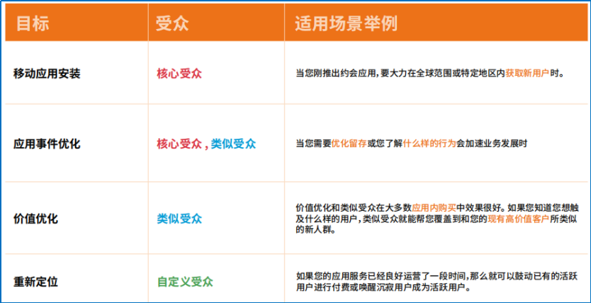 平台之后,细化用户。自定义广告受众时,广告主通过设置受众的地区、人口、兴趣、行为和关联度,可以更精准地触达目标受众。而在产品运营的不同阶段,受众的范围设置也应有所不同,对此Facebook 给出了以下适用场景案例,如下图。
