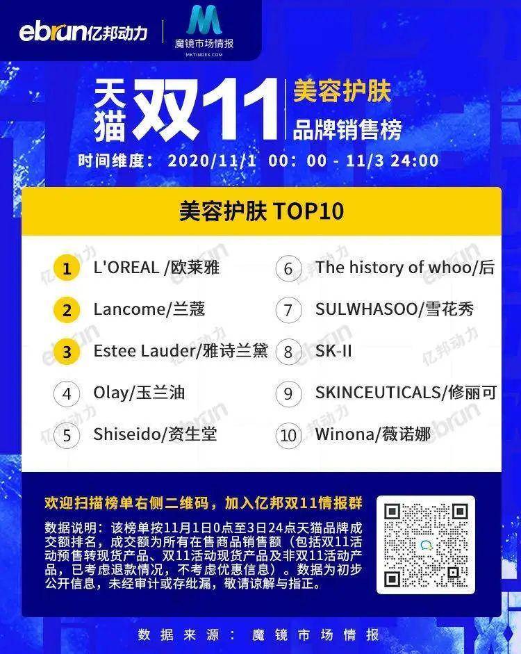 从预售到第一波爆发结束,美妆品牌一直是双11的主角。根据天猫官方数据,在今年双11开场首小时的十大爆款中,美妆类品牌以7个席位成为最大赢家,消费者的购物车甚至远超了品牌方的预期,资生堂、芙丽芳丝、IPSA等品牌旗下的多款单品一开场就断了货。而雅诗兰黛也成为了今年天猫双11第一个破10亿的品牌。