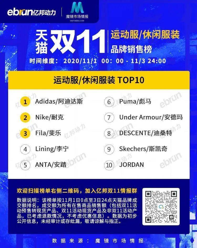 天猫官方在第一轮爆发过后也公布了品牌双店的交易排行。这是以往双十一未曾有过的现象,不得不说奥莱店的业绩(也就是站外引流的业绩)在今年被格外地重视起来。