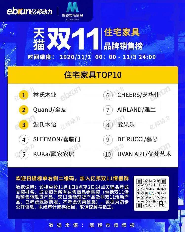 11月1日,开售1小时内,天猫上就产生了38个销量过1000万的单品,其中林氏木业、全友家居、顾家家居等品牌成交额快速突破了1亿。据悉,当日开通天猫轻店的10万余家线下家装门店,成交额平均增收2万元,当日新增客流6成来自线上。而参与了联动的林氏木业、全友家居、顾家家居等均上榜了第一波爆发的类目TOP5。