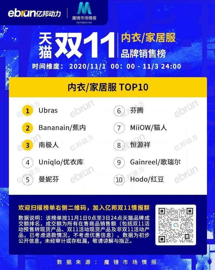 和大部分被国际大牌抢镜的品类不同,内衣家居服品类是国内品牌占据了主场,且由两个新品牌遥遥领先。从预售期到双11的第一波正式爆发,Ubras、蕉内稳稳占据类目榜一榜二,但一年前的双11里,Ubras还榜上无名,蕉内也还只是第五名。