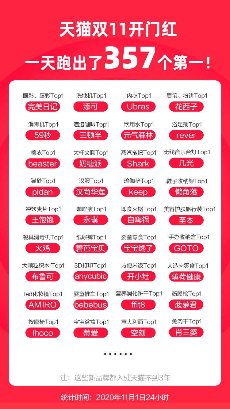 在今年8月,天猫官方第一次公开提及双11节奏变为两次爆发时就提到,第一次爆发阶段会重点扶持过往一年全新的品牌、全新的商品,围绕产业带和全球货品给予特殊的供应和支持。但在预售期到第一次爆发各阶段的榜单中仍未见到产业带商家的身影,官方仅表示,“天猫双11首日产业带‘厂货’成交额为去年17倍”。