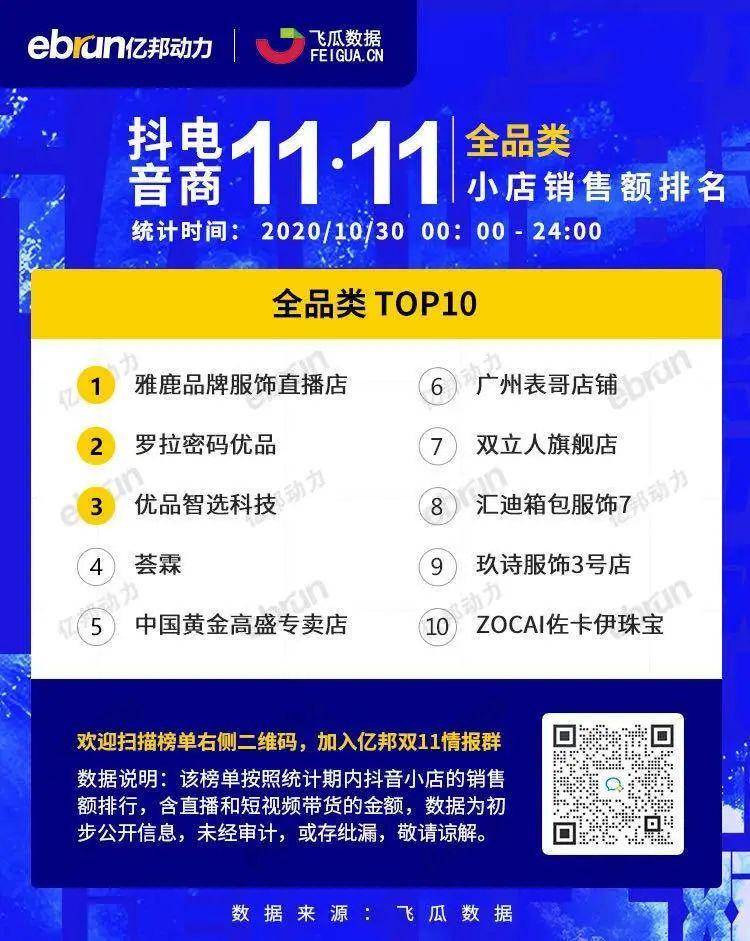 数据显示,在10月30日(抖音电商11.11宠粉节首个爆发日)的抖音小店销售排行中,“雅鹿品牌服饰直播店”为销售额冠军,“罗拉密码优品”位列第二,“优品智选科技”位列第三,排在四到十的则依次为“荟霖”、“中国黄金高盛专卖店”、“广州表哥店铺”、“双立人旗舰店”、“汇迪箱包服饰7”、“玖诗服饰3号店”、“ZOCAI佐卡伊珠宝旗舰店”。这意味着,抖音小店销售额Top当中,仅有双立人和佐卡伊两个品牌旗舰店,其余均为品牌经销商、产业带商家或贸易型商家。
