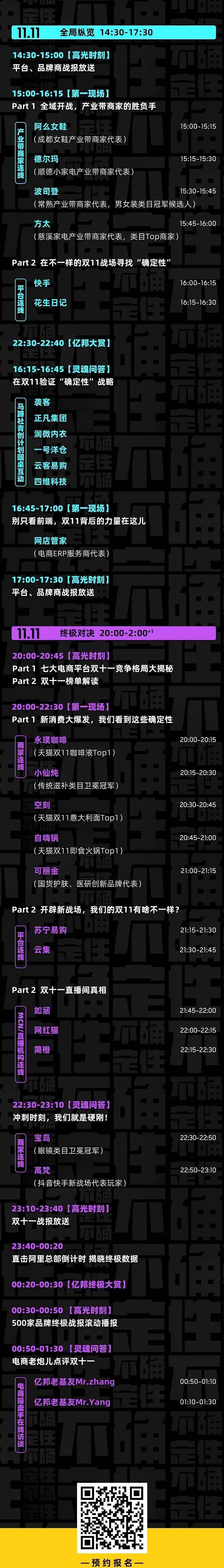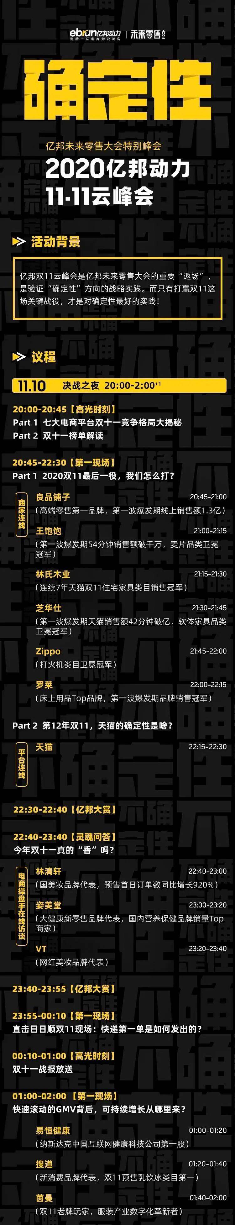 2020年双11已经过半,或许第一波成绩一定程度代表了最终结果,但第一次经历新节奏的商家们仍希望在这种不确定性里寻找新的机会。11月11日双11“决战之夜”,亿邦动力11.11云峰会带你一起观战,了解平台和商家们是如何打赢关键战役,找到不确定性中的确定性增长。
