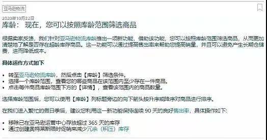 公告中亚马逊还向卖家给出建议,移除已在履行中心存放超过365天的库存;通过清仓促销活动来减少冗余(积压)库存。从而降低卖家的成本,保持连续90天的良好售出率。