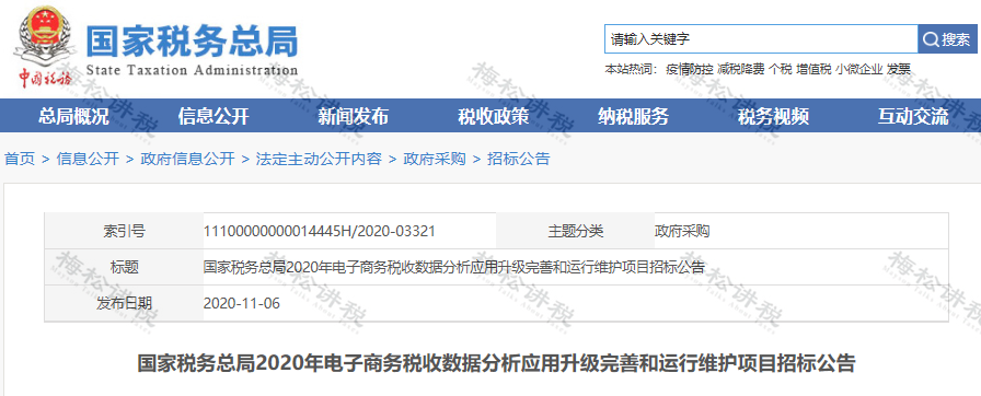 国家税务总局的网站上发布了“2020年电子商务税收数据分析应用升级完善和运行维护项目”招标公告。