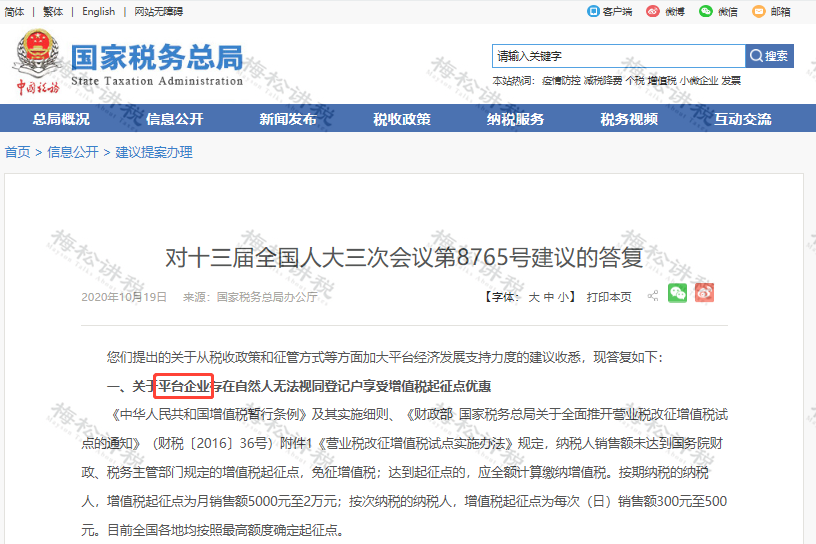 1、平台经济中的自然人能否享受月销售额10万元(季度销售额30万元)以下免征增值税的优惠,主要看是否做了税务登记。