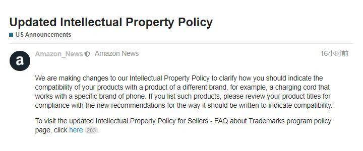 说来也巧,近日,亚马逊再次更新知识产权政策,发布了关于品牌兼容性的新指导方针,以帮助卖家以规避侵权问题的发生,相关的公告截图如下: