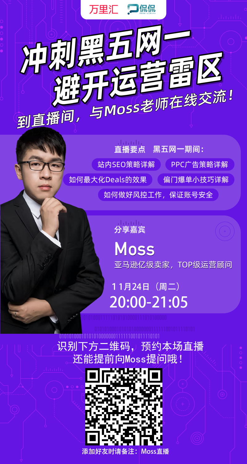 11月24日20点,你的以上疑惑都将迎刃而解!侃侃创始人、亚马逊亿级卖家Moss老师将带来一场重磅直播,当天不仅会跟大家分享黑五网一的制胜绝招,还会详解PPC优化策略、偏门爆单技巧、账号风控等旺季干货,同时将在线解答各位老铁的“疑难杂症”。