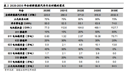 根据海通证券的模型测算,到 2025 年新能源汽车行业电池用镍量将达到 32.3 万吨,较 2020 年年均增速为 52%。到2030 年用镍量将达到 84.5 万吨,较 2020 年年均增速为 36%。
