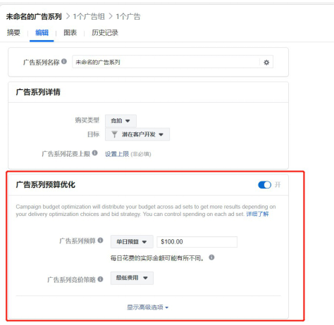 如果要使用CBO,只需点击一下(广告系列设置界面打开)。